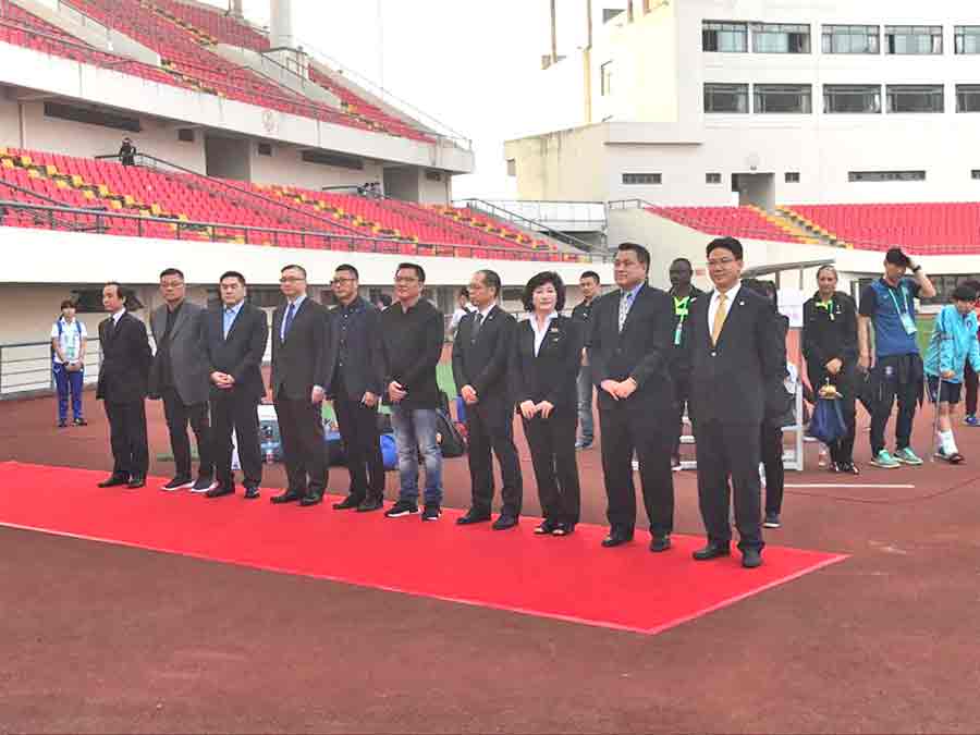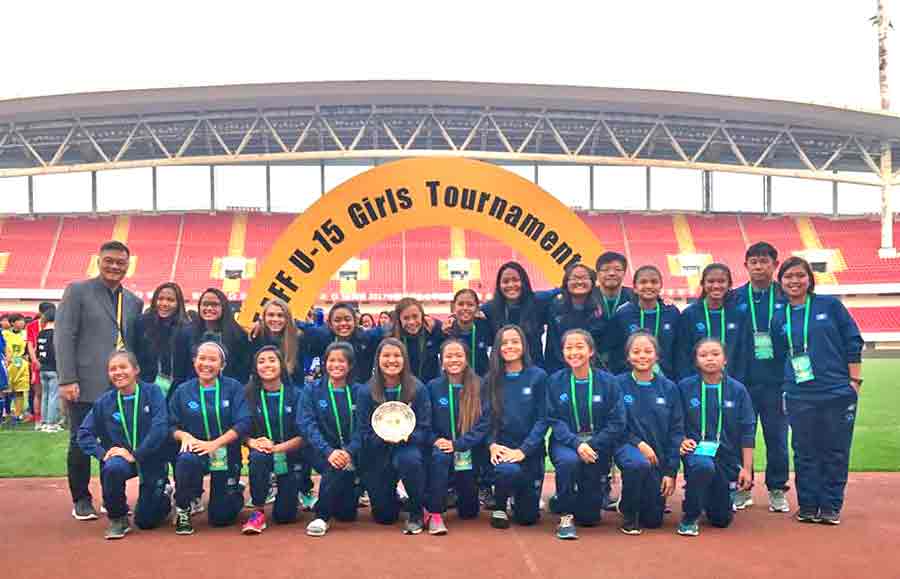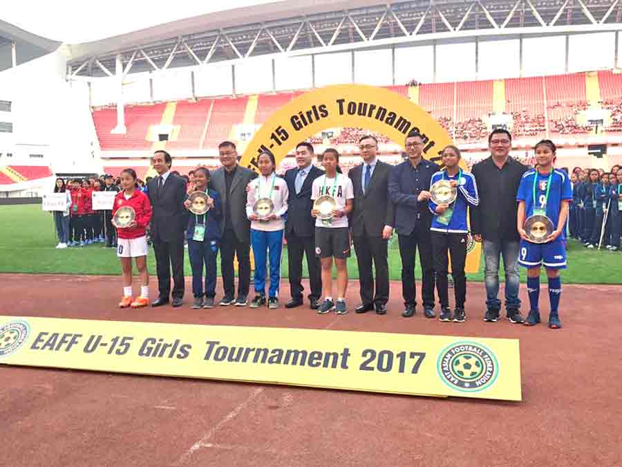 Northern Mariana Islands Football Association president Jerry Tan, standing left, joins the CNMI Girls U15 National Team players and officials for a group photo during the awards ceremony for the EAFF event.