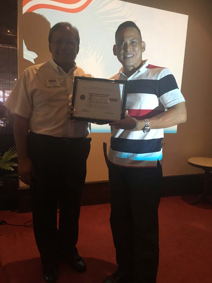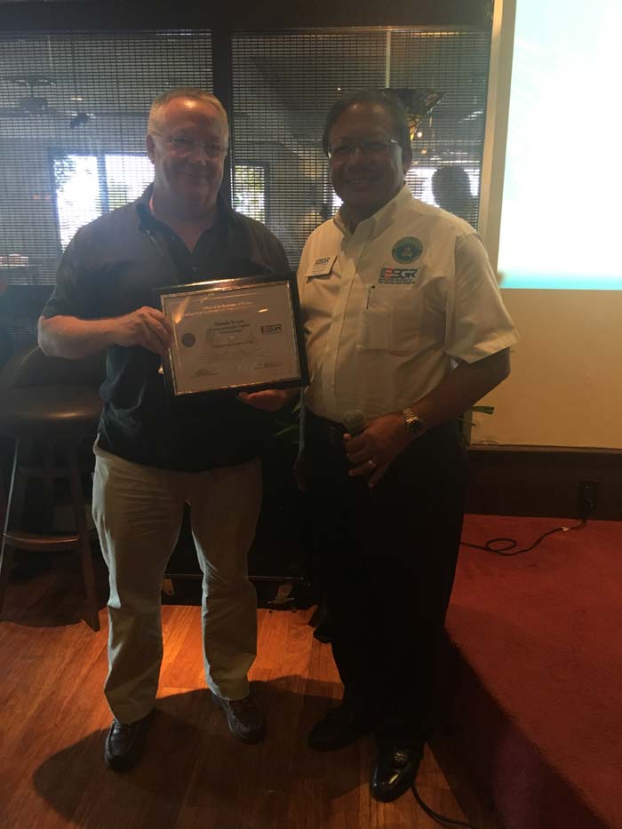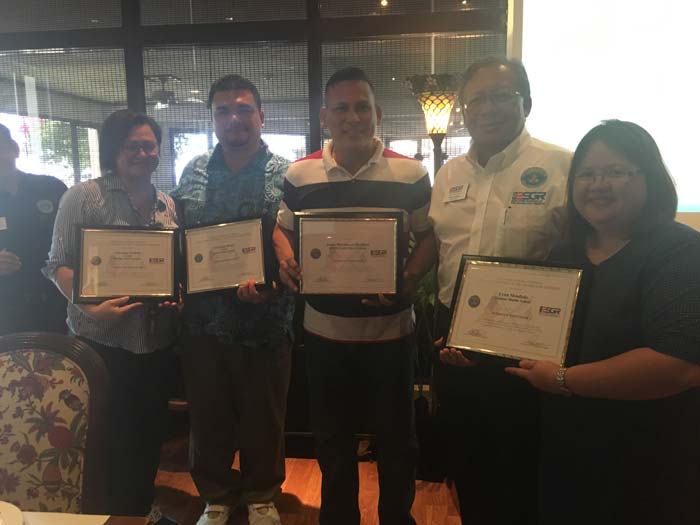 David Sablan, left, Guam-NMI chair of the Employer Support of the Guard and Reserve, presents Jonas Barcinas with The Patriotic Employer Award yesterday at an ESGR luncheon at the Aqua Resort Club. (Kimberly A. Bautista)
