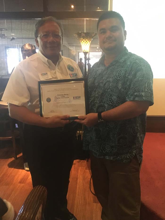 David Sablan, left, Guam-NMI chair of the Employer Support of the Guard and Reserve, presents Victorino Borja with The Patriotic Employer award yesterday during the ESGR luncheon at the Aqua Resort Club. (Kimberly A. Bautista)