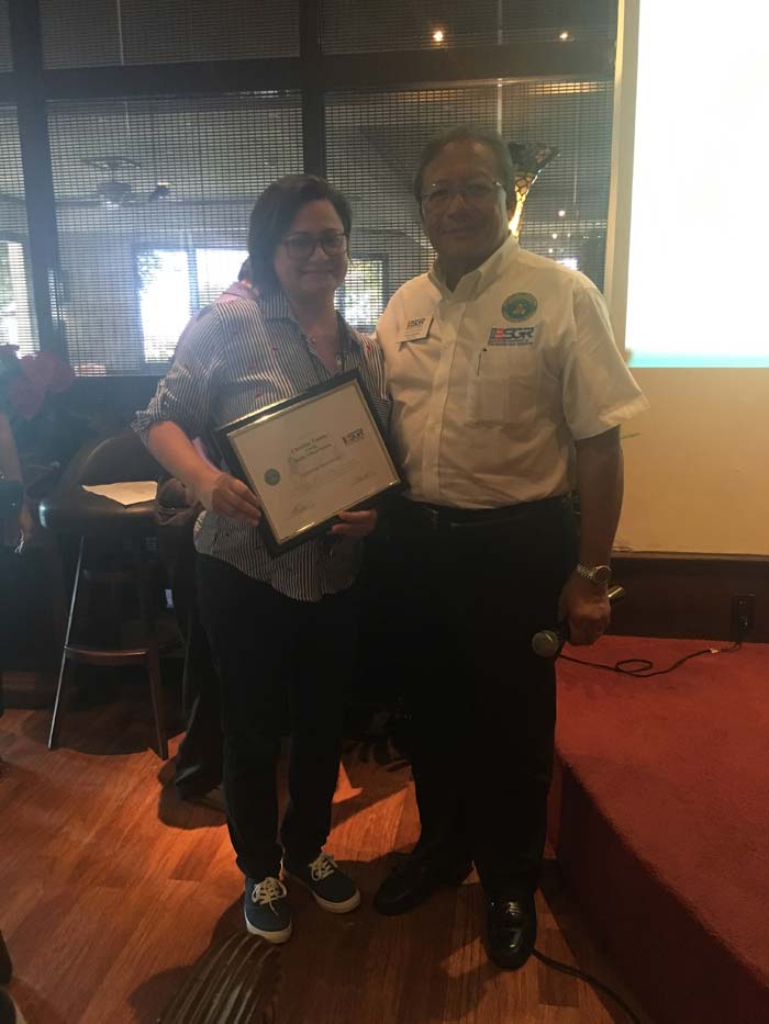 Simada Iramk from the Commonwealth Utilities Corp. is presented with The Patriotic Employer Award by David Sablan, right, Guam-NMI chair of the Employer Support of the Guard and Reserve, yesterday during the ESGR luncheon at the Aqua Resort Club. (Kimberly A. Bautista)