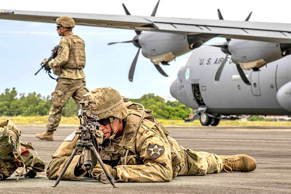Private 1st Class Benjamin Alley, an infantryman serving with A Company, 5th Battallion, 20th Infantry Regiment, 1-2 Stryker Brigade Combat Team, 7th Infantry Division, stages in a security posture while more of his fellow soldiers exit a C-130 Hercules at the Palau International Airport last April 13, 2019, as part of Exercise Palau. U.S. (ARMY/SGT. 1ST CLASS WHITNEY C. HOUSTON)