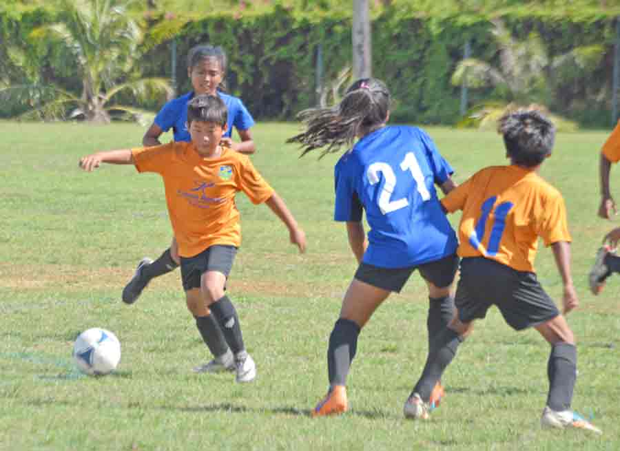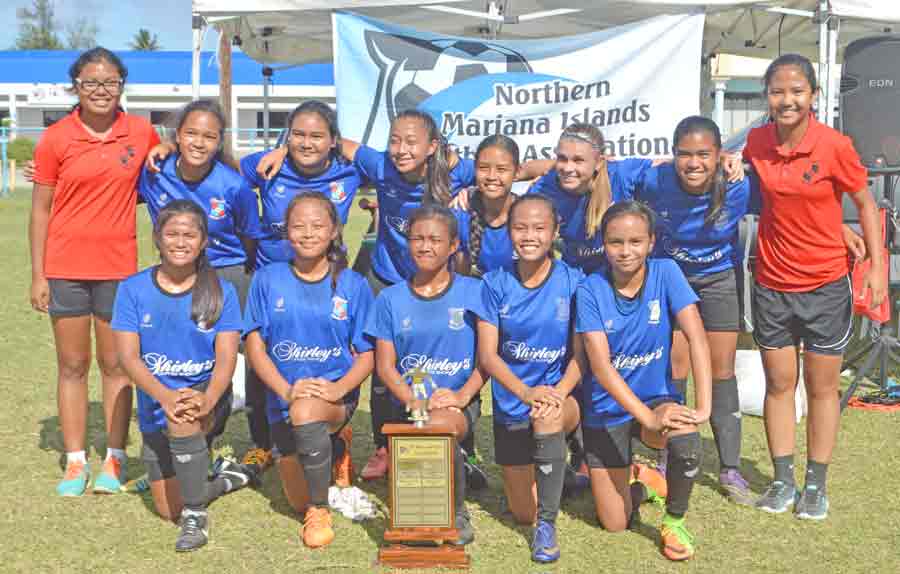 Shirley’s Football Club Girls U15 players and coaches pose with the perpetual trophy after downing Kanoa FC-1 U12 in the finals of the FA Boys and Girls Cup 2017 held last Saturday at the Hopwood Middle School Field.