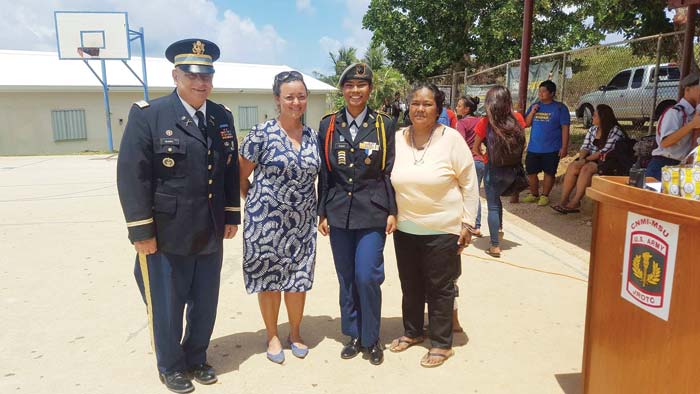 Senior Army instructor, Capt. James Burke, Kagman High School principal Leila Staffler, the new battalion commander, cadet Lt. Col. Kayleen Faisao, and the battalion commander's mother, Jennifer Tedtaotao. (Contributed Photo)