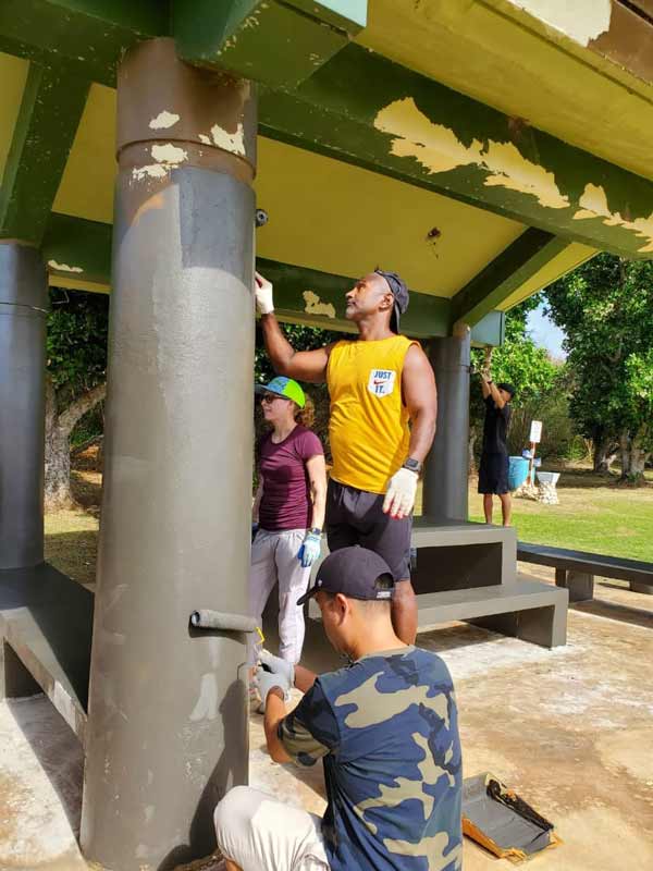 Besides continuing with the repainting job at Grotto Pavilion 2, the seven FEMA staff and representatives from Bibong Corp./Marianas Lighthouse, Loco & Taco Dining Bar, Divewish, Tasi & the Ali’is, and International Roller Skates have also started working on Pavilion 1 and finished marking the parking lines for buses and the upper parking area.