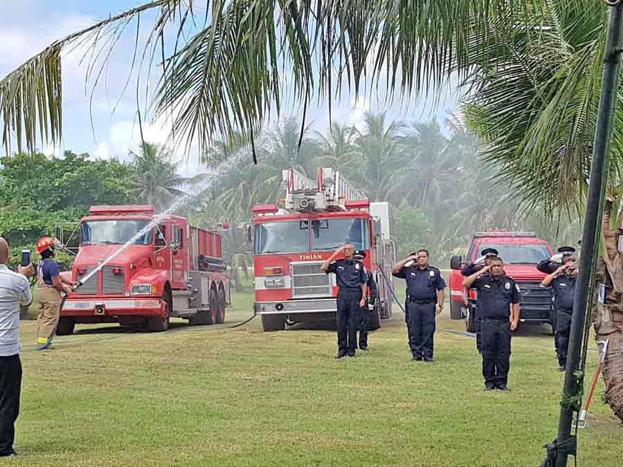 The Department of Fire and Emergency Medical Services on Tinian performs a water canon salute during the Field of Heroes ceremony last Monday at the Tinian Veterans Memorial Park.