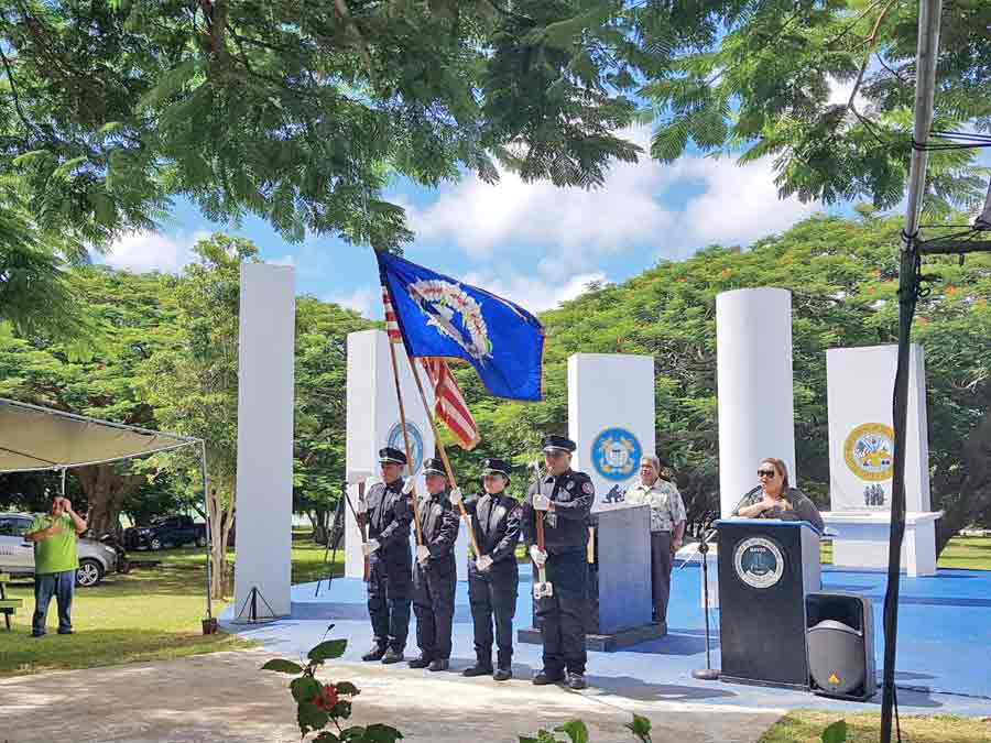 The Department of Fire and Emergency Medical Services color guard posts the flags during the Field of Heroes ceremony last Monday at the Tinian Veterans Memorial Park.