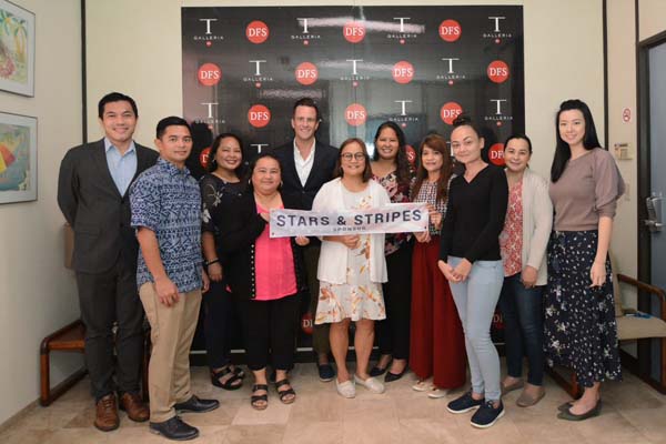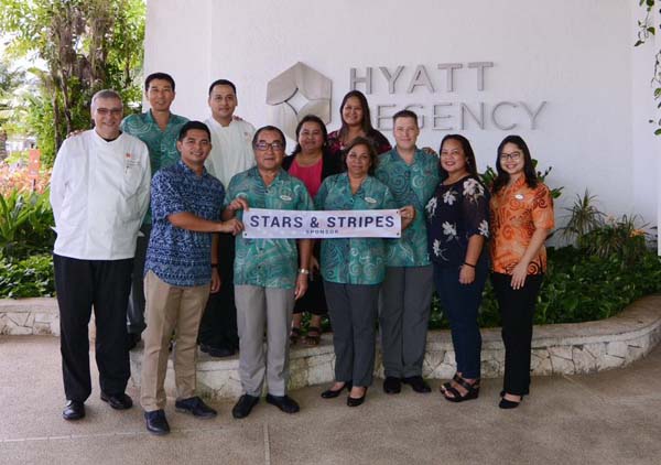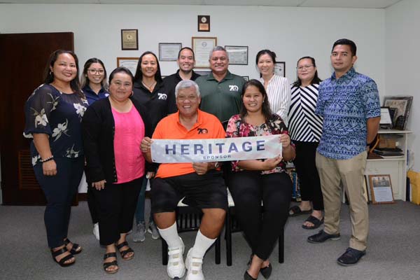 JC Tenorio Enterprises, Inc. vice president Clarence T. Tenorio, seated left, holds the heritage sponsor sign with TanHoldings vice president for Corporate Affairs/HR Catherine Attao-Toves during the donation presentation attended by other JC Tenorio officials.