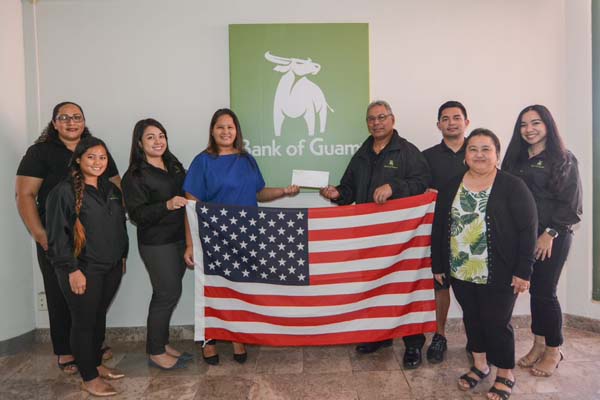 Bank of Guam vice president/branch manager Larry Phillip, fifth left, hands over the check donation to TanHoldings vice president for corporate affairs/HR Catherine Attao-Toves, fourth left.