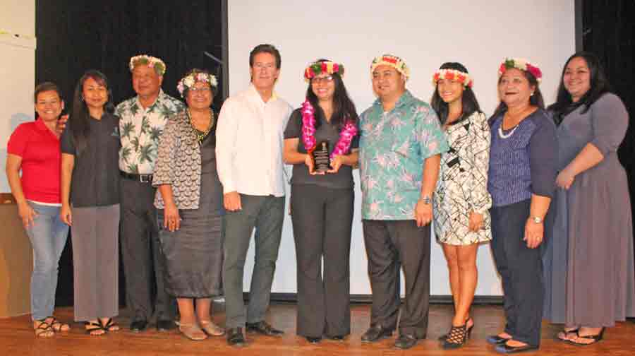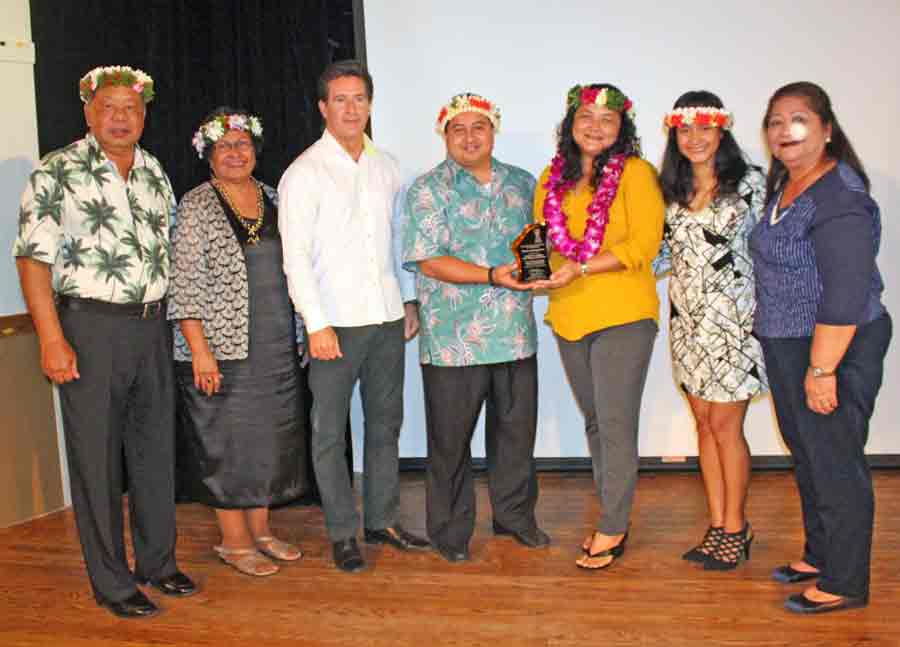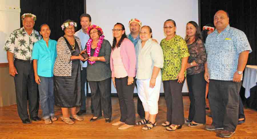 San Vicente Elementary School principal Paulette Tomokane-Sablan received the Woman in Education Award from Gov. Ralph DLG Torres, first lady Diann Torres,, Imperial Pacific chair Mark Brown, chai Felicidad Ogumoro, Saipan Mayor David Apatang and committee member Doris Drew. (IPI-CSR)