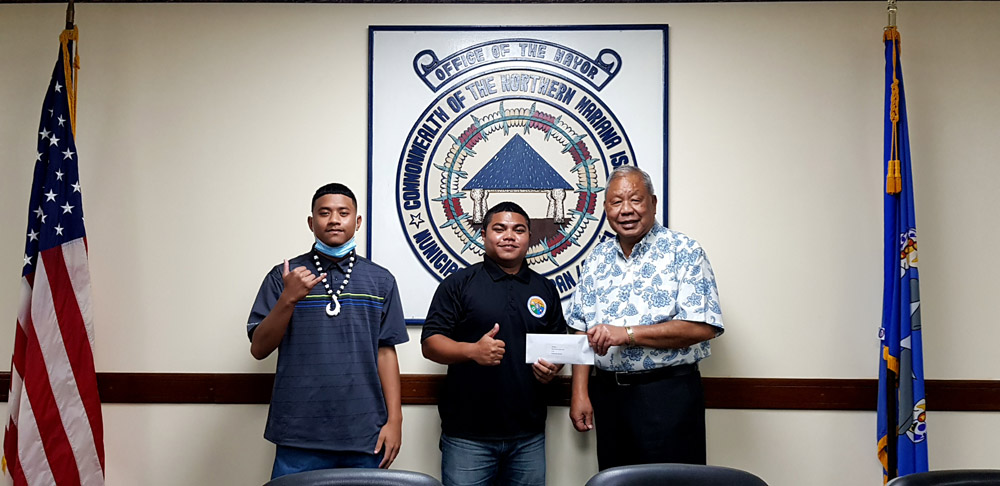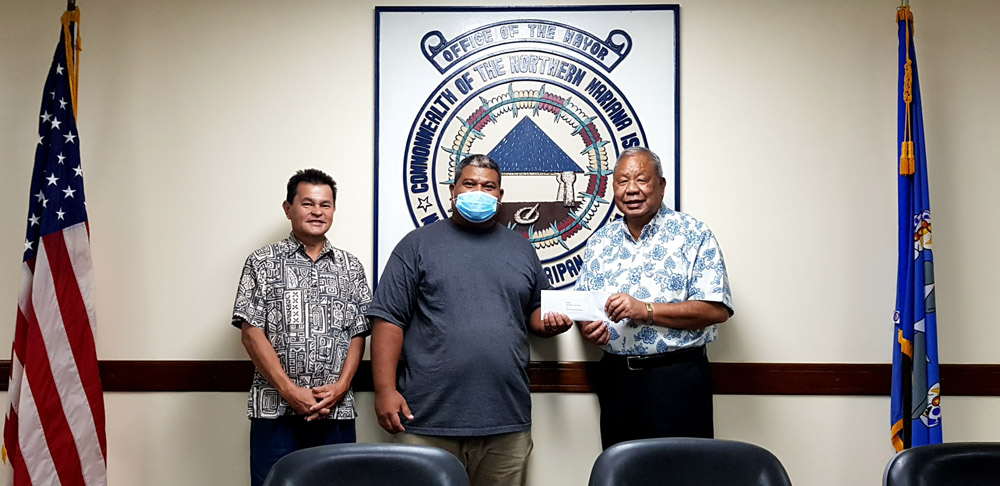 As one of the two groups that placed third for best float in the 2022 Liberation Day parade, Triple J representatives receive their monetary prize at the award presentation last July 18, 2022, at the Saipan Mayor’s Office in Susupe.