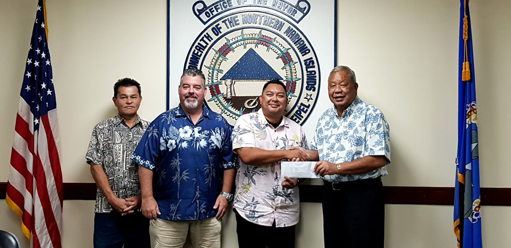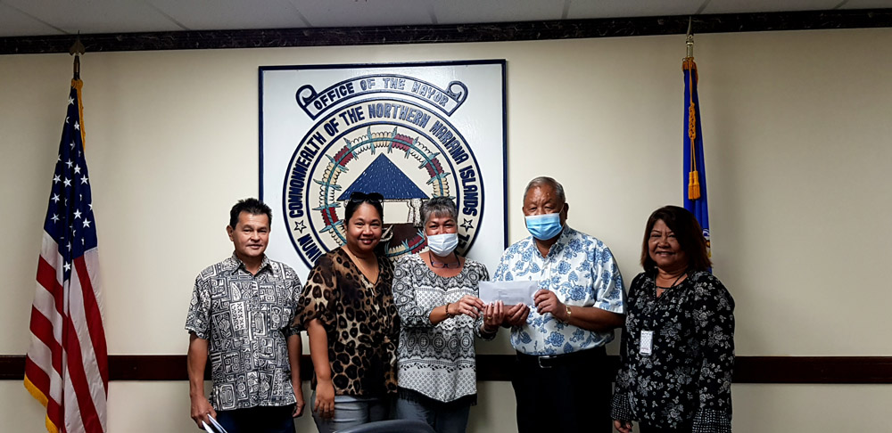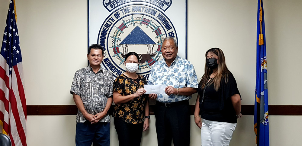 Representatives of the Department of Commerce, one of the four groups that tied for second place in best float competition of the 2022 Liberation Day parade, receive their monetary prize at the award presentation last July 18, 2022, at the Saipan Mayor’s Office in Susupe.