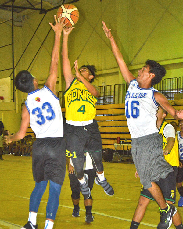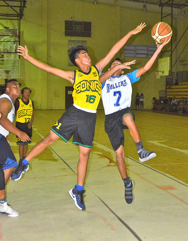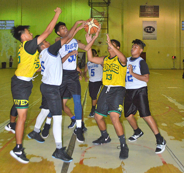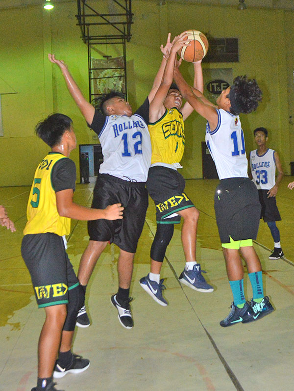 670 Sonics and RT Law NMI Rollers players battle for the rebound during the first half of their title game in the 2018 Frank M. Diaz Memorial Youth League held early this month at the Gilbert C. Ada Gymnasium.