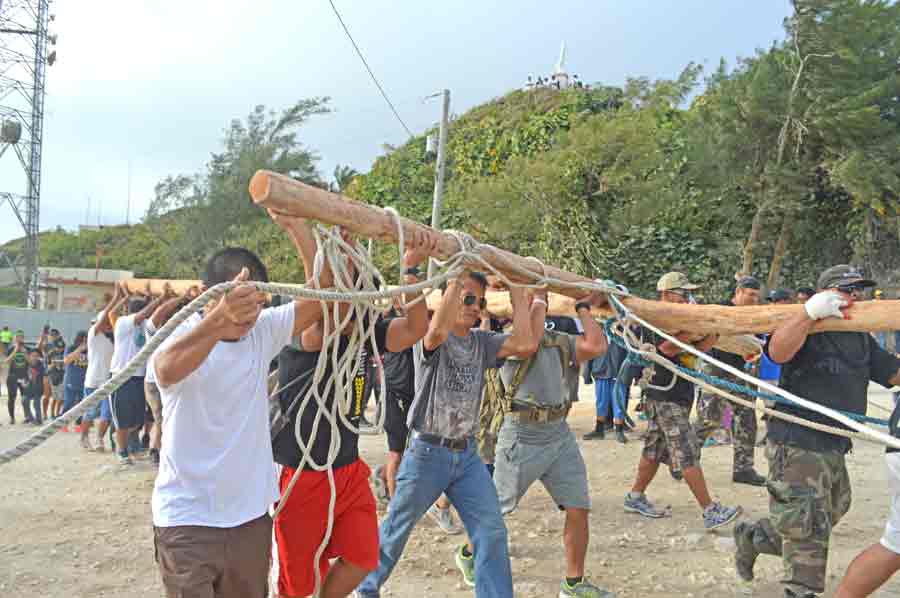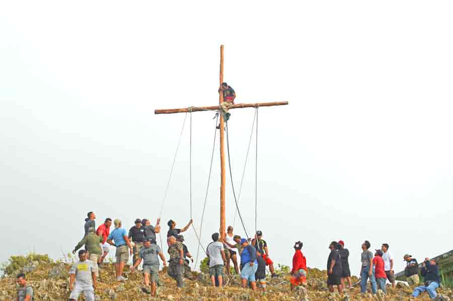 Catholic devotees successfully mount the 30-foot cross at the peak of Mt. Tapochau after a few attempts during the annual Good Friday trek last Friday.