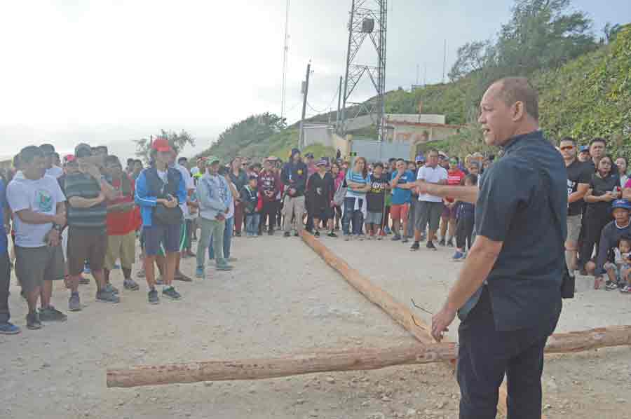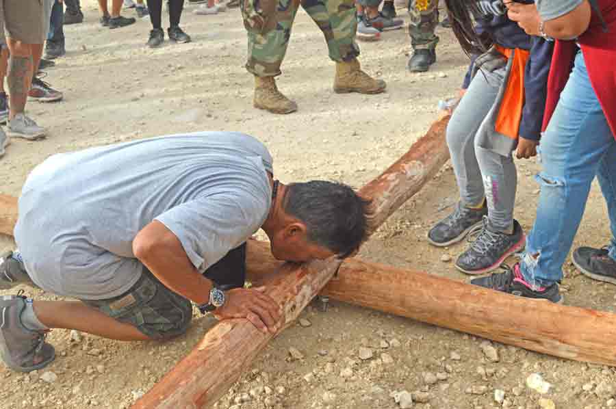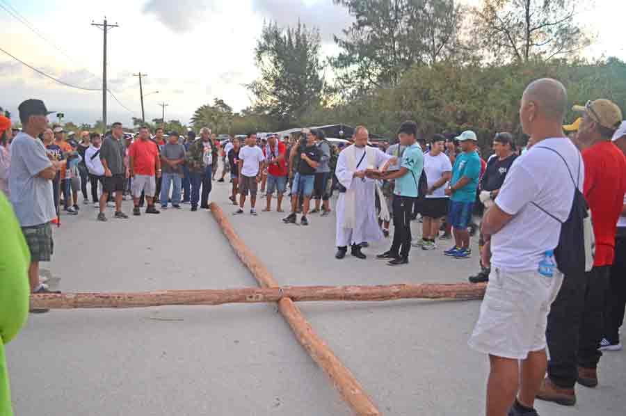 San Antonio Parish’s Fr. Romil Aperocho says a few prayers before the 30-foot cross is mounted during the annual Good Friday trek last Friday up Mt. Tapochau.