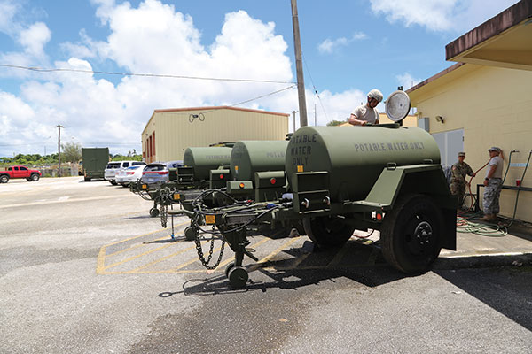 Sgt. Edwin Senato, top left, Staff Sgt. Consolacion Bartonico, center, and SPC Milo Mapote, from the Guam Army National Guard’s Hotel Company, 29th Brigade Support Battalion, 29th Infantry Brigade Combat Team, conducts pre-maintenance checks on and fills three water buffalos at Fort Juan Muna in Harmon as the Guard prepares to support the upcoming typhoon and recovery efforts. (GUAM NATIONAL GUARD)