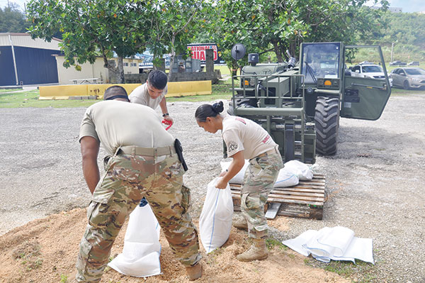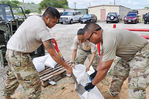 SPC Peter Zapatos, SPC Michael Fejeran and SPC Lorenshelea Candaso, from the Guam Army National Guard’s Hotel Company, 29th Brigade Support Battalion, 29th Infantry Brigade Combat Team, fill sand bags at Fort Juan Muna in Harmon as the Guard secures its facilities and prepares to support the upcoming typhoon and recovery efforts. (GUAM NATIONAL GUARD)