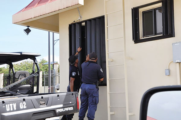 Chief Frankie Cruz and Anthony San Nicolas, from the Department of Military Affairs, secure the guard facility at the entrance of the Guard’s Readiness Center in Barrigada in preparation for the upcoming typhoon. (GUAM NATIONAL GUARD)