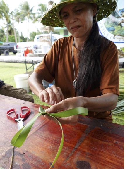 Germaine Deleon Guerrero weaves coconut fronds at the opening of Hafa Adai-Tirow Tuesdays and Thursdays on the evening of Aug. 1, 2022, at the Carolinian Utt in Garapan. Deleon Guerrero learned coconut frond weaving from her father, Jesus Deleon Guerrero. (MVA)