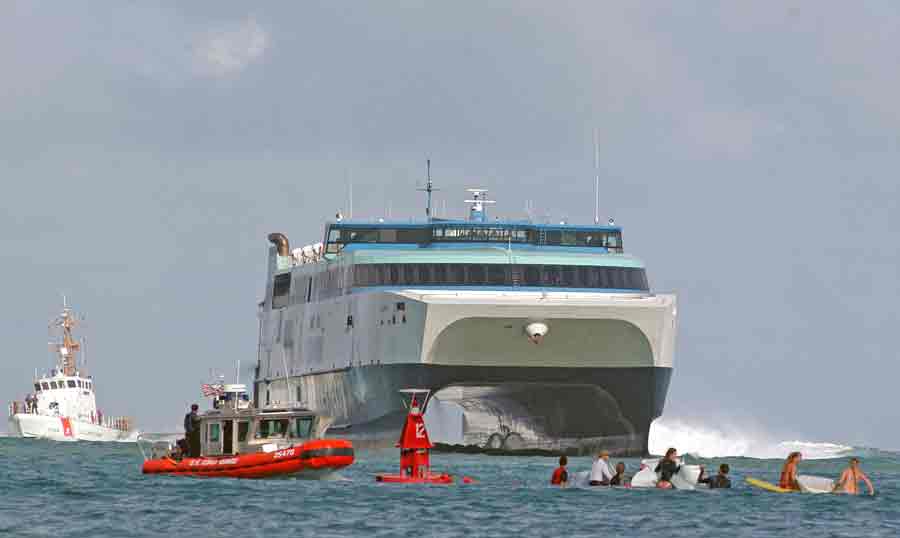In this Dec. 13, 2007, file photo, Hawaii’s Superferry makes its entry into the Kahalui Harbor escorted by the U. S. Coast Guard and heavy law enforcement surveillance. (AP)