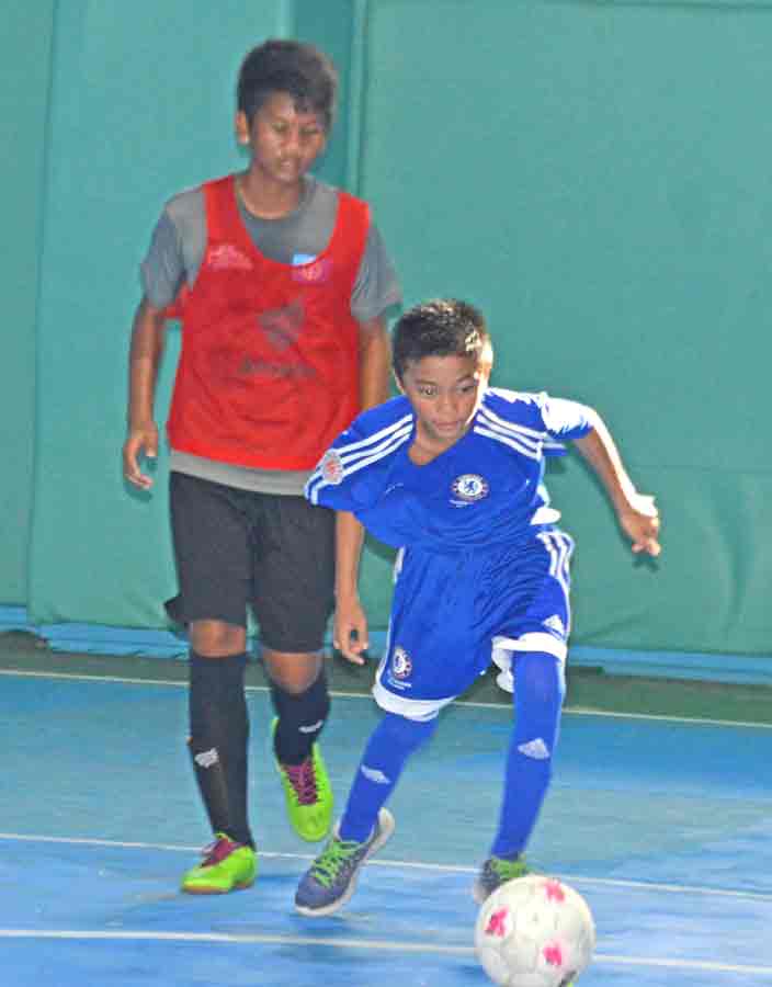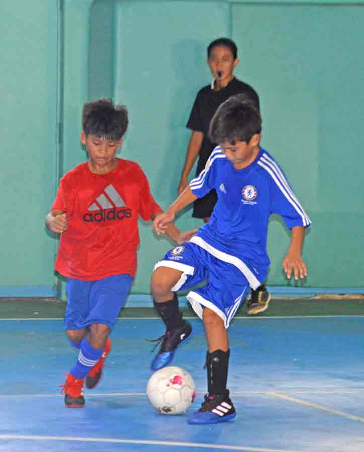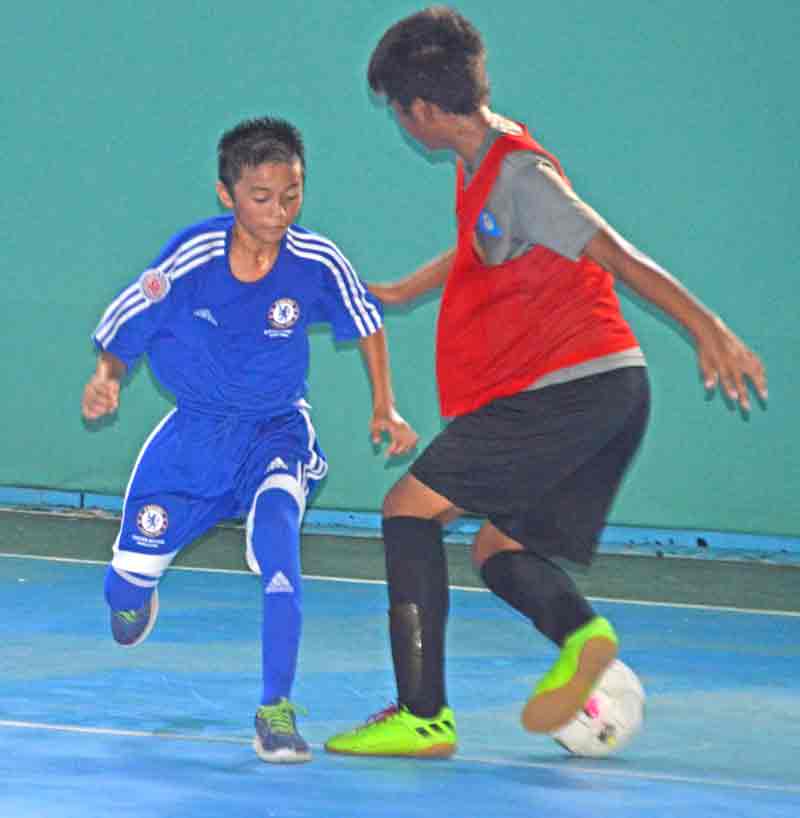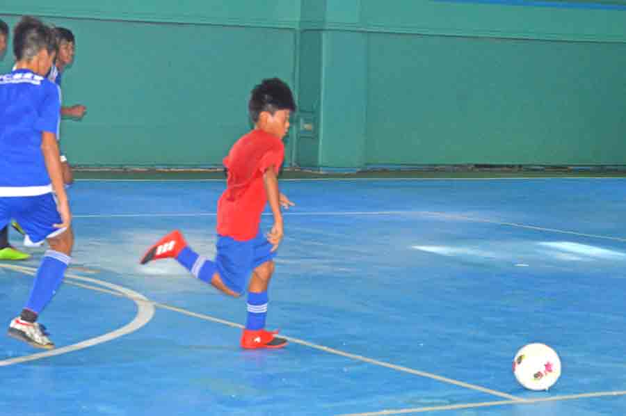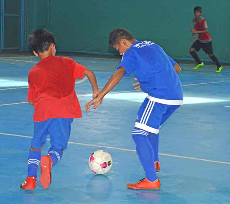 An HK SSS player, right, dribbles away from NMI U16’s John Ezekiel Canape during their boys U16 game in the Saipan Soccer School’s 2017 Youth Summer Futsal Tournament last month at the TSL Sports Complex.