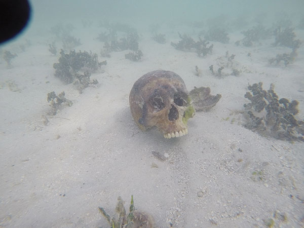 Photo shows the skull that was found underwater several feet away from a wreckage near the Garapan Fishing Base Tuesday afternoon. (AQUASMITH)