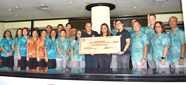 Representatives of the Make-A-Wish Foundation Guam and CNMI, Salvation Army, the CNMI Center for Living Independently, and Dandan Middle School STEM and Garden Club receive the ceremonial check from Hyatt Regency Saipan officials led by hotel general manager Nick Nishikawa. (Jon Perez)