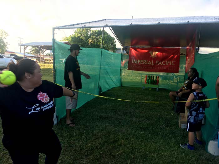 Imperial Pacific International CSR executive director Geri Dela Cruz demonstrates to young participants at the baseball throw section of their carnival games booth. (Contributed Photo)