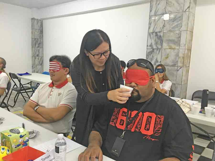 Corporate Learning & Development assistant manager Hazel Tang tests the trainees’ sense of smell as a part of the senses segment of the training. (Contributed Photo)