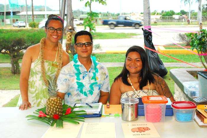 IPI CSR coordinator Edilyn Benjamin, manager Alex Palacios, and event treasurer Selmalyn Taitano greet guests as they arrive at the Minatchom Atdao Pavilion.