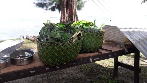 IPI Corporate Social Responsibility team members Martin, Alex, and J.R. create plates made out of banana leaves for food tasting. (Contributed Photos)