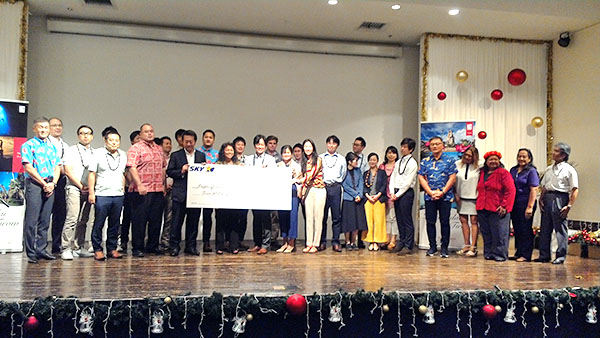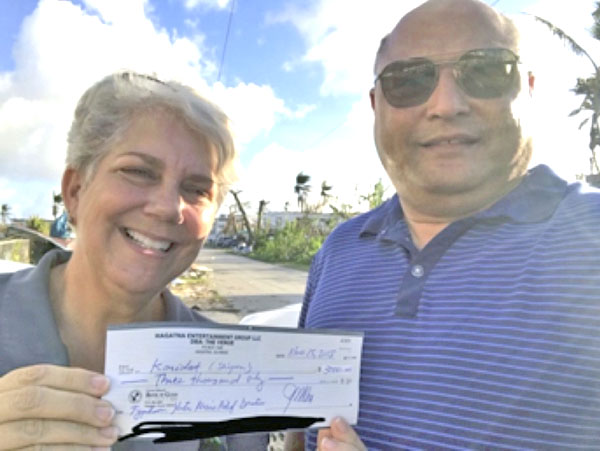 DONATION TO KARIDAT Hagatna Entertainment Group led by Phil Roberto and a host of entertainers in Guam—79 & Friends, Siracha, the Dolls, and Biggah & Bettah—has donated $3,000 to Karidat’s Super Typhoon Yutu long-term recovery mission. “These guys got together right after the typhoon and put together a fundraising concert for their friends and family up here on Saipan and Tinian,” said Lauri Ogumoro, executive director of Karidat. “When we explained to Phil how Karidat will be helping with the long-term recovery mission for the victims of Super Typhoon Yutu, he was all for it.” “Knowing that the recovery from Typhoon Soudelor took about three years, we foresee many years of helping our community to recover from the devastation of Yutu. The process will be long and hard for many individuals and families,” said Ogumoro. She said that Roberto did have one special request: for Karidat to share a portion of the donation with the Mercedarian Sisters at Maturana who have been sheltering five families whose homes were completely destroyed. (Contributed Photo)