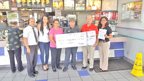 McDonald’s Saipan owner/operator Marcia Ayuyu along with her staff present a $1,000 check to American Red Cross-NMI Chapter. (Contributed Photo)