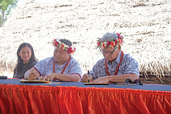 FLAME TREE ARTS FESTIVAL-Gov. Ralph DLG Torres signs the Flame Tree Arts Festival proclamation with Lt. Gov. Arnold I. Palacios as first lady Diann Tudela-Torres looks on. The cultural heritage of performing arts, traditional crafts, visual arts, and literary arts in the CNMI will be the highlight this week, with April 11 to April 14 named the Flame Tree Arts Festival Week. (Contributed Photo)