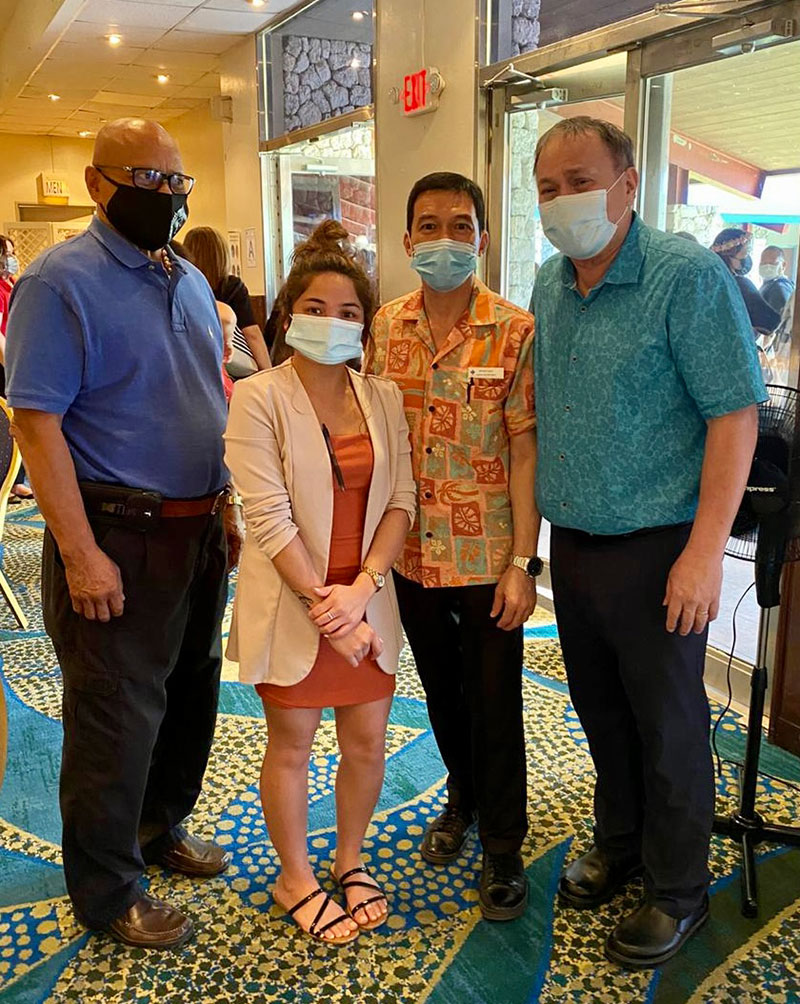 ADMINISTRATIVE PROFESSIONALS DAY-Jeff Cruz, second right, a food and beverage supervisor at Fiesta Resort & Spa Saipan, and his daughter, Jenevieve Cruz, administrative assistant at Kagman High School, are congratulated by Board of Education chair Andrew L. Orsini, right, and vice chair Herman Atalig, left, during last week’s Administrative Professionals Day celebration. (CONTRIBUTED PHOTOS)