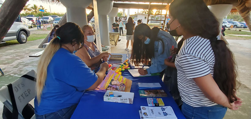 Mariah Barcinas, leftmost, and Missy Aldan, second from left, hand out slap bracelets, tops, and information pamphlets at the Division of Youth Services booth during DYS’ Family Fun Night at the San Vicente Youth Center last Friday. (JOSHUA SANTOS)