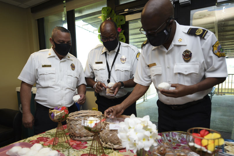 From left, Emergency Medical Services Chief Tom Manglona, Special Operations Chief James Scribner, and Regional Fire Chief Russell Tarver of Joint Region Marianas Fire and Emergency Services, partake in a spread of local dishes in celebration of CHamoru Month at JRM headquarters. CHamoru month, observed in March, highlights the history and heritage of the people of Guam and the CNMI. (U.S. NAVY/SHAINA O’NEAL)