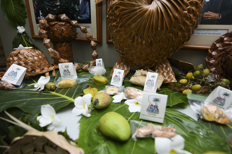 A display of woven items, local fruits and foods, welcomes visitors at Joint Region Marianas headquarters in Asan. The display was prepared by JRM staff in honor of CHamoru Month.