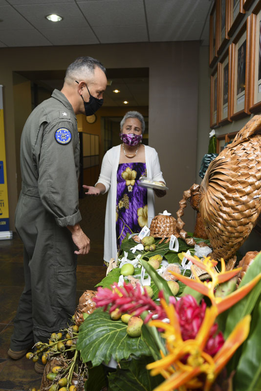 MES CHAMORU-ASAN, Guam—Rear Adm. John Menoni, commander, Joint Region Marianas, checks out a cultural display with Annie Fejeran, financial technician, at JRM headquarters in Asan. The display, prepared by JRM staff, highlighted local weaving, fruit and treats in honor of CHamoru Month, which celebrates the history and heritage of the people of Guam and the Northern Mariana Islands. (U.S. NAVY/SHAINA O’NEAL)