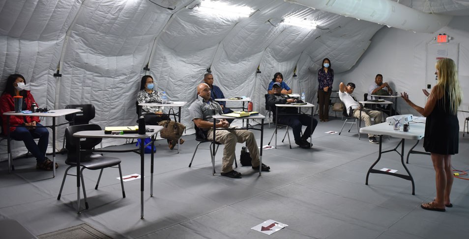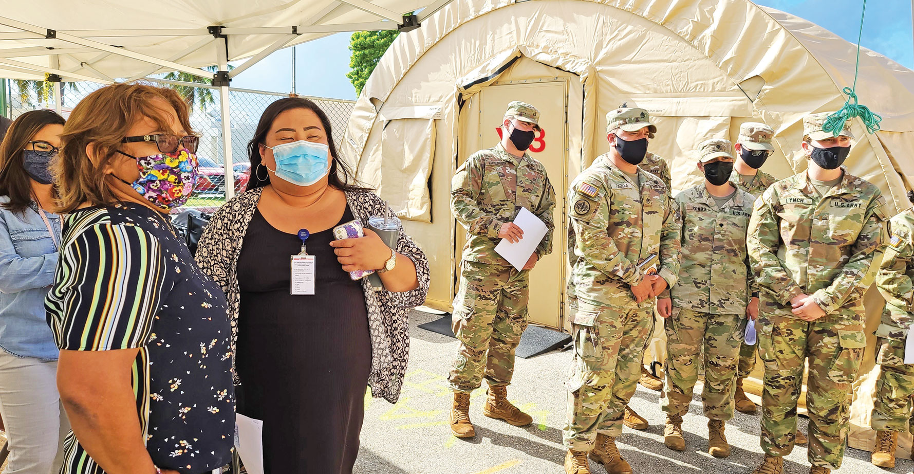 TOUR OF MCATS-Commonwealth Healthcare Corp. chief executive officer Esther Muna, left, and CHCC Corporate Quality and Performance Management manager Halina Palacios observe an orientation briefing for incoming U.S. Army medics, assigned to 25th Infantry Division, who will support CHCC’s vaccination team in administering COVID-19 vaccines to local community members in Saipan. (U.S. NAVY/BRAD RUSZALA)