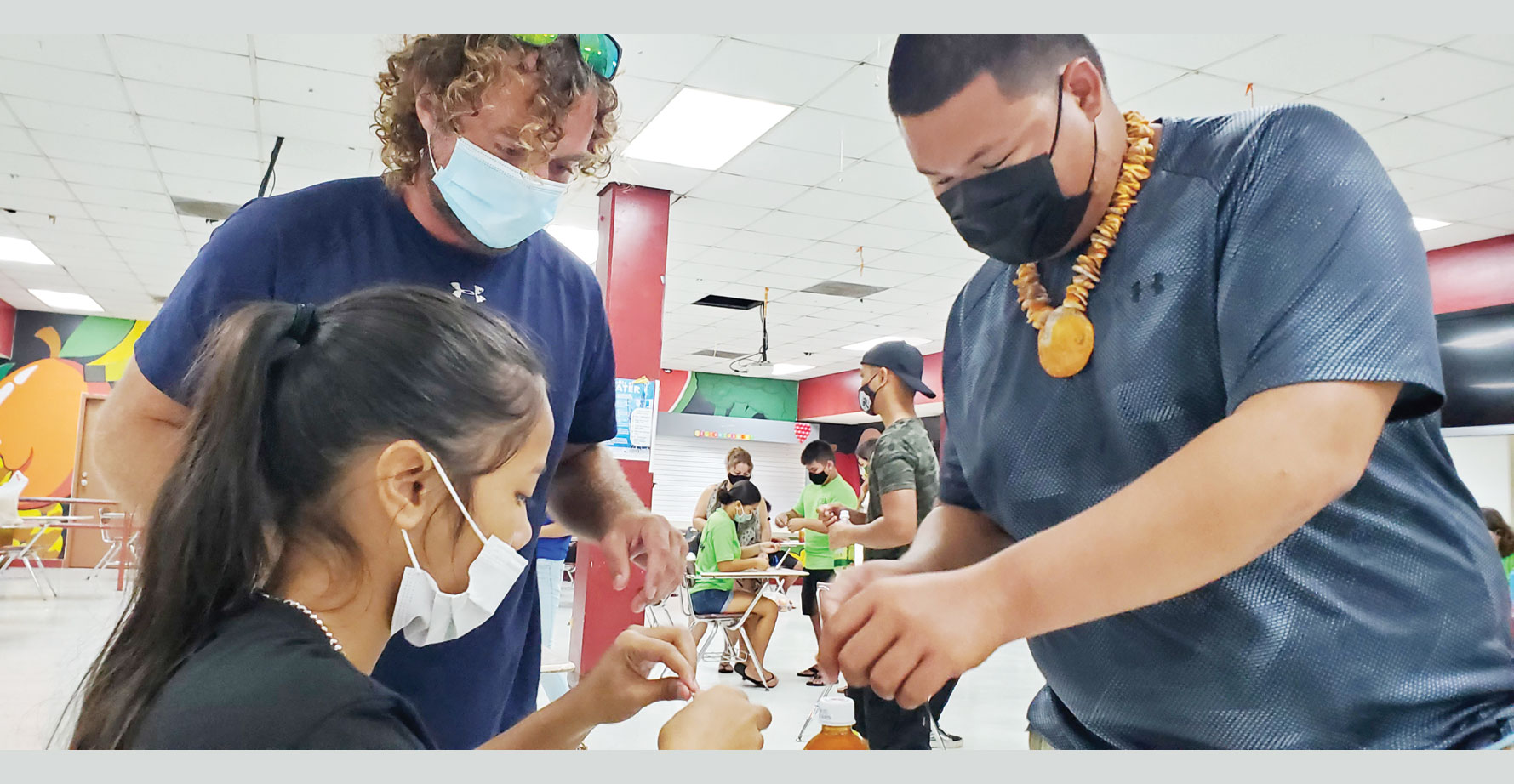 STARTING ‘EM YOUNG-Tasi to Table Inc. instructors Dan Wollak, standing left, and Derik Reyes Jr., standing right, teach a student how to attach a lure to a fishing line last Saturday during the presentation of fishing rods and other fishing necessities to TTT members at the Kagman High School cafeteria. The equipment were donated by Fishing Tackle and Sporting Goods. (JOSHUA SANTOS)