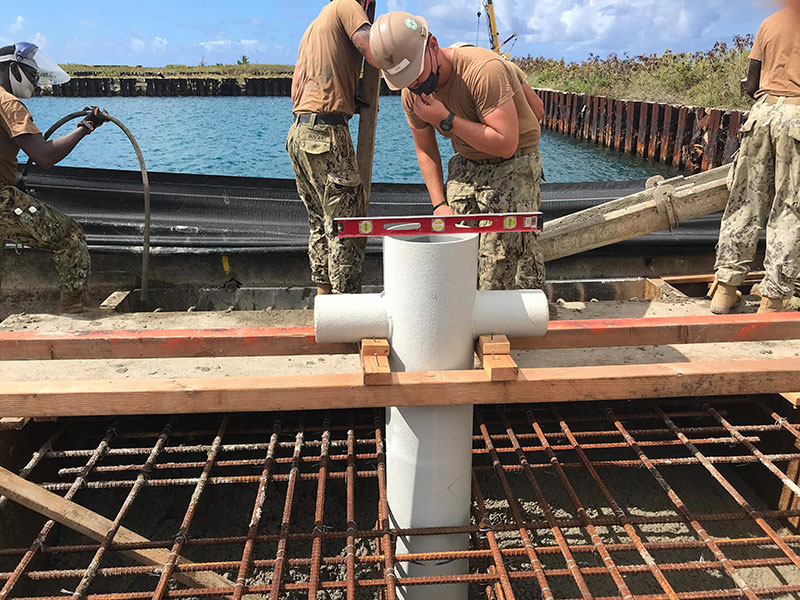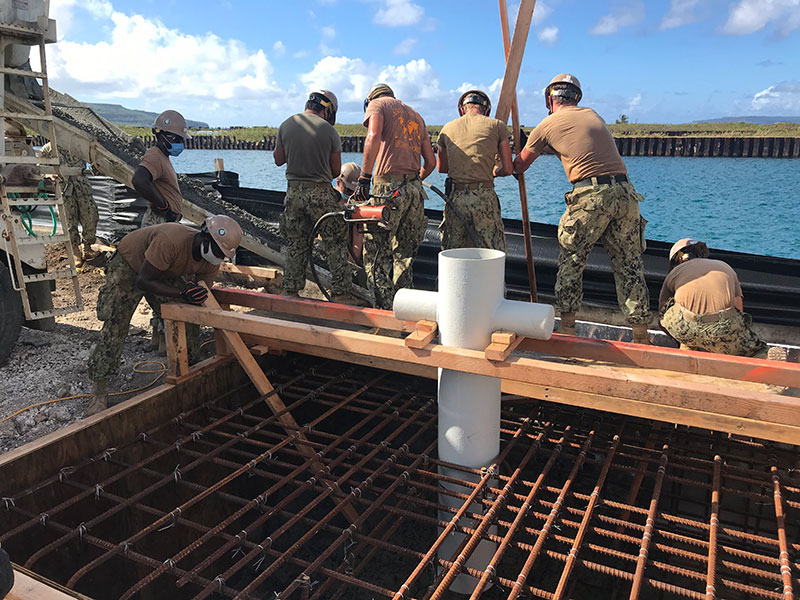 TINIAN HARBOR REPAIR-Seabees assigned to Naval Mobile Construction Battalion 4 on Tinian place concrete for the foundation of a mooring bollard at the Tinian Harbor. The repair project will enhance the Port of Tinian for future operations. NMCB 4 is forward deployed throughout the Indo-Pacific region, ready to support major combat operations, theater security, humanitarian assistance and disaster relief operations. Seabees provide general engineering and civil support to Navy, Marine Corps and joint operational forces globally. (PETTY OFFICER 2ND CLASS WENHAN FAN)