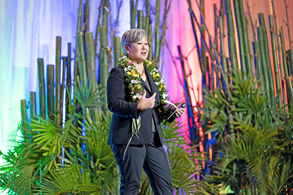 CONFERENCE ON ISLAND SUSTAINABILITY Conference on Island Sustainability keynote speaker Suzanne Vares-Lum, the new president of the East-West Center in Hawaii as of January, shares what her father told her after surveying various Micronesian islands with the Army in 1962: “We have a lot to learn from those who live there … there’s no such thing as an orphan, there’s no such thing as someone who’s homeless… there was no such thing in 1962. There wasn’t an idea that you wouldn’t share everything you had with someone else.” She spoke at the University of Guam conference on April 7 at the Hyatt Regency Guam. (UOG)