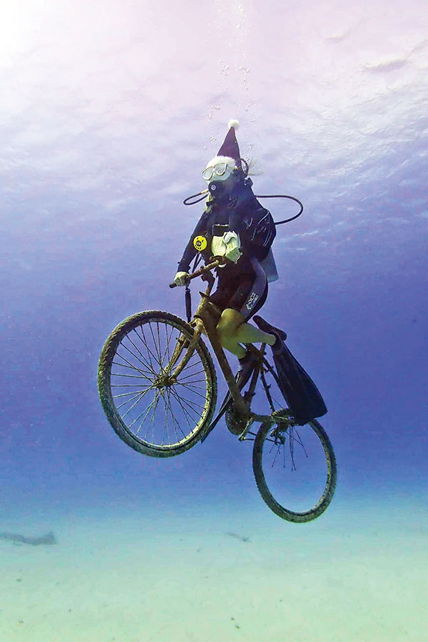 UNDER THE SEA-Ayano Braxton appears to be riding this bike she found at the bottom of the waters off Obyan Beach while scuba diving last Christmas Eve. (SUPER FISH DIVING)