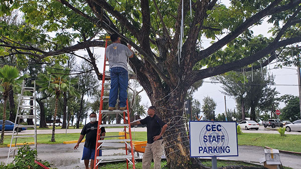 TREE LIGHTING-Bad weather did not stop employees of the Pedro P. Tenorio Multi-Purpose Center from installing Christmas lights on a tree in front of the Commonwealth Election Commission office in Susupe last week. The Christmas Village and Christmas Tree Lighting by first lady Diann Torres and Wella Palacios was supposed to be done last Sunday, but was canceled due to rain. (FERDIE DE LA TORRE)