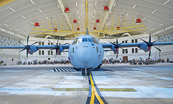 ‘PUSH’ CEREMONY-A U.S. Air Force C-130J Super Hercules assigned to the 36th Airlift Squadron, sits in a hangar during the Operation Christmas Drop “Push” Ceremony at Andersen Air Force Base in Guam last Dec. 6, 2021. Over the course of 10 days, crews will airdrop donated food, supplies, educational materials, and tools to 55 islanders throughout the Southeastern Pacific, including the Federated States of Micronesia and the Republic of Palau. The weeklong international effort allows Pacific Air Forces airmen to work with partner nations to execute low-cost, low-altitude air drops. (U.S. AIR FORCE/SSG DIVINE COX)