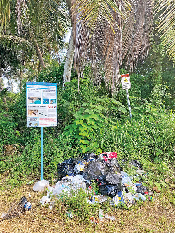 ATTENTION, LITTER PATROL!-A mound of garbage is piled in this corner of Wing Beach, which is one of the pore popular beaches on Saipan, creating an eyesore and attracting vermin and stray animals to the site. (MARK FARMER)