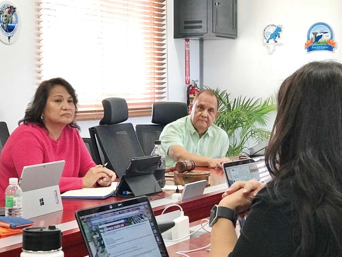 Board of Education chair MaryLou S. Ada and board member Herman T. Guerrero listen as PSS associate commissioner for Student and Support Services Yvonne R. Pangelinan, foreground, explains a point during yesterday’s meeting.