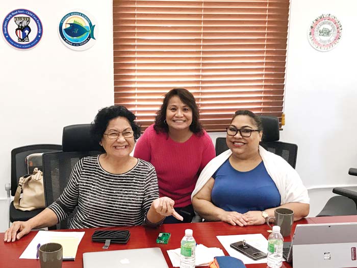 Board of Education chair MaryLou S. Ada, vice chair Janice Marie A. Tenorio, and board member Florine M. Hofschneider beam during the brief break of the meeting on Capital Hill.