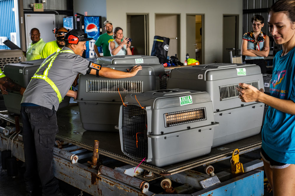 OFF THEY GO!-Volunteers check to make sure the cages full of boonie dogs are secure before their flight to Guam on Monday morning as part of the effort to reduce strays in the CNMI by adopting them out to families in the United States. (CONTRIBUTED PHOTO)
