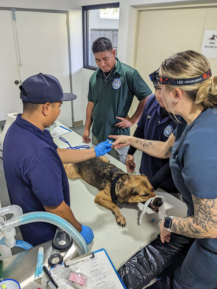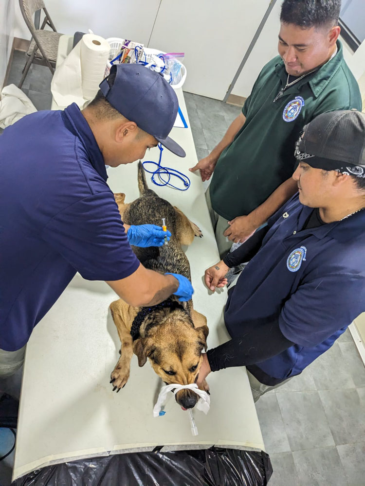 Calvin Borja, left, administers a shot, while Simion Nepayo, top right, and Derek Deleon Guerrero, assist during the first day of the spay/neuter clinic at the Saipan Mayor’s Office Dog Shelter in As Perdido. (CONTRIBUTED PHOTO)